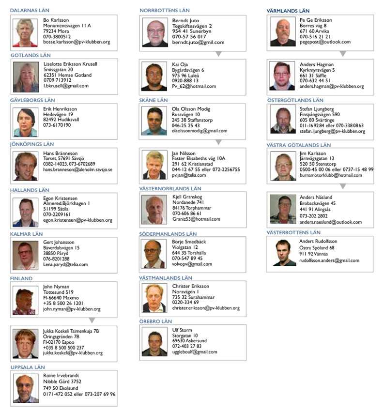 Svenska Volvo PV-klubbens lokala kontaktpersoner kan hjälpa dig om du har frågor med lokal anknytning. Önskar du få information om träffar i din landsända, eller vill hjälpa till att anordna en träff, tveka då inte att ta kontakt med någon av våra kunniga och hjälpsamma kontaktpersoner.